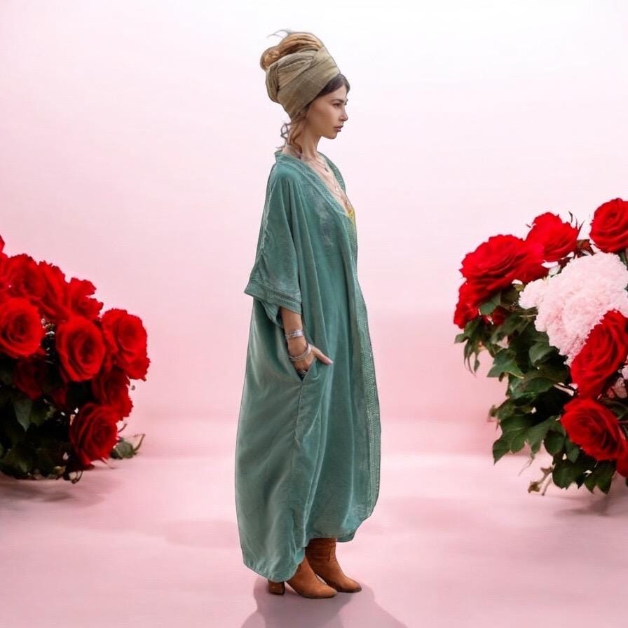 Step into bohemian elegance with the Seafoam Lace Misty Velvet Kimono Duster by ZinniaPearl. Crafted from luxurious silky velvet with a breathable rayon lining, this plus-size friendly boho jacket drapes effortlessly, offering both comfort and sophistication. Designed with delicate lace trim detailing, this misty seafoam green duster exudes vintage charm, making it the perfect statement piece for weddings, festivals, and elevated everyday wear.