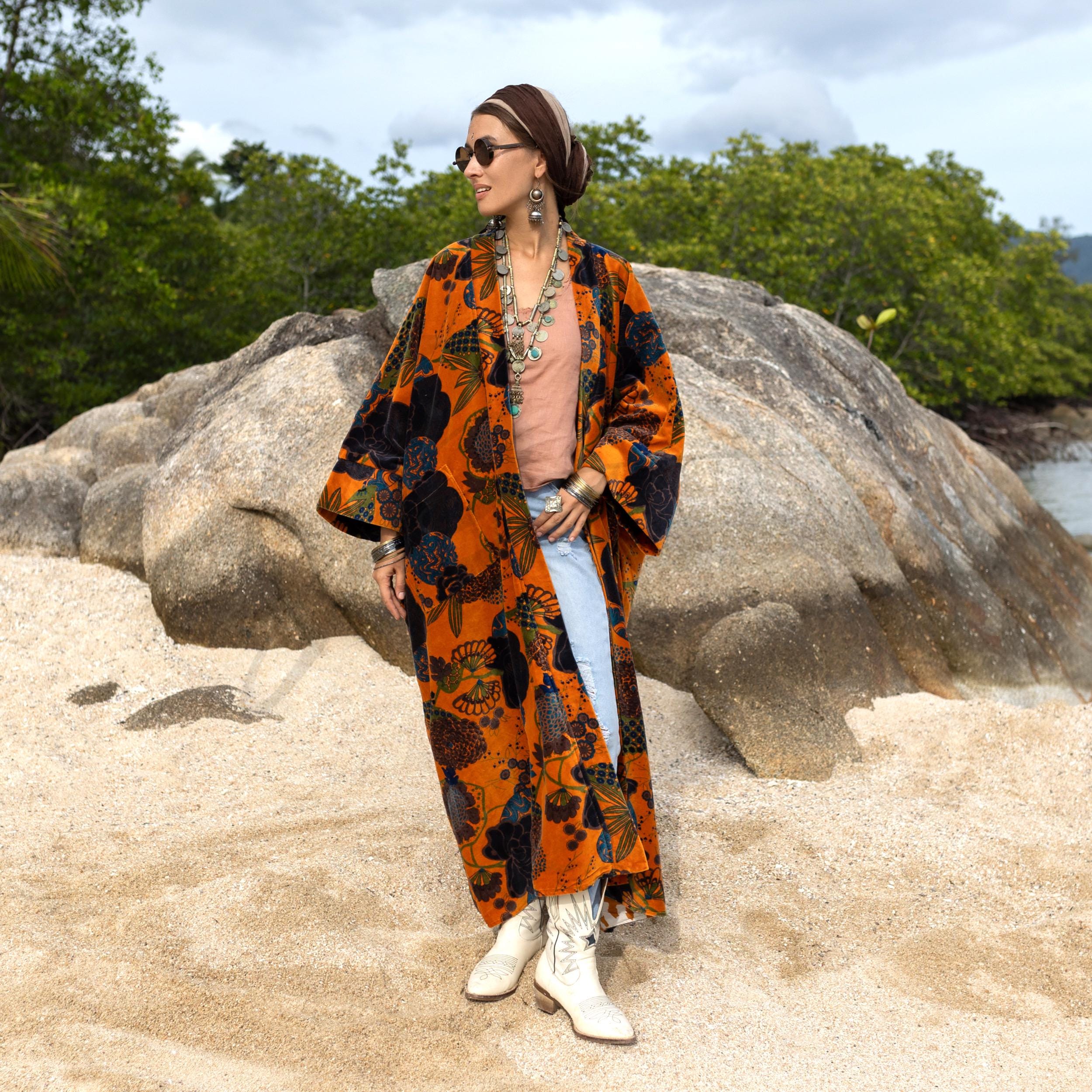 Wrap yourself in effortless bohemian luxury with the Harper Jade Velvet Kimono Duster, now in the radiant Sunfire Bloom colorway. Handcrafted from plush 100% cotton velvet, this statement robe blends softness with richness, unfolding in a bold tapestry of marigold, terracotta, and deep earthy tones. A true celebration of warmth, artistry, and confidence.