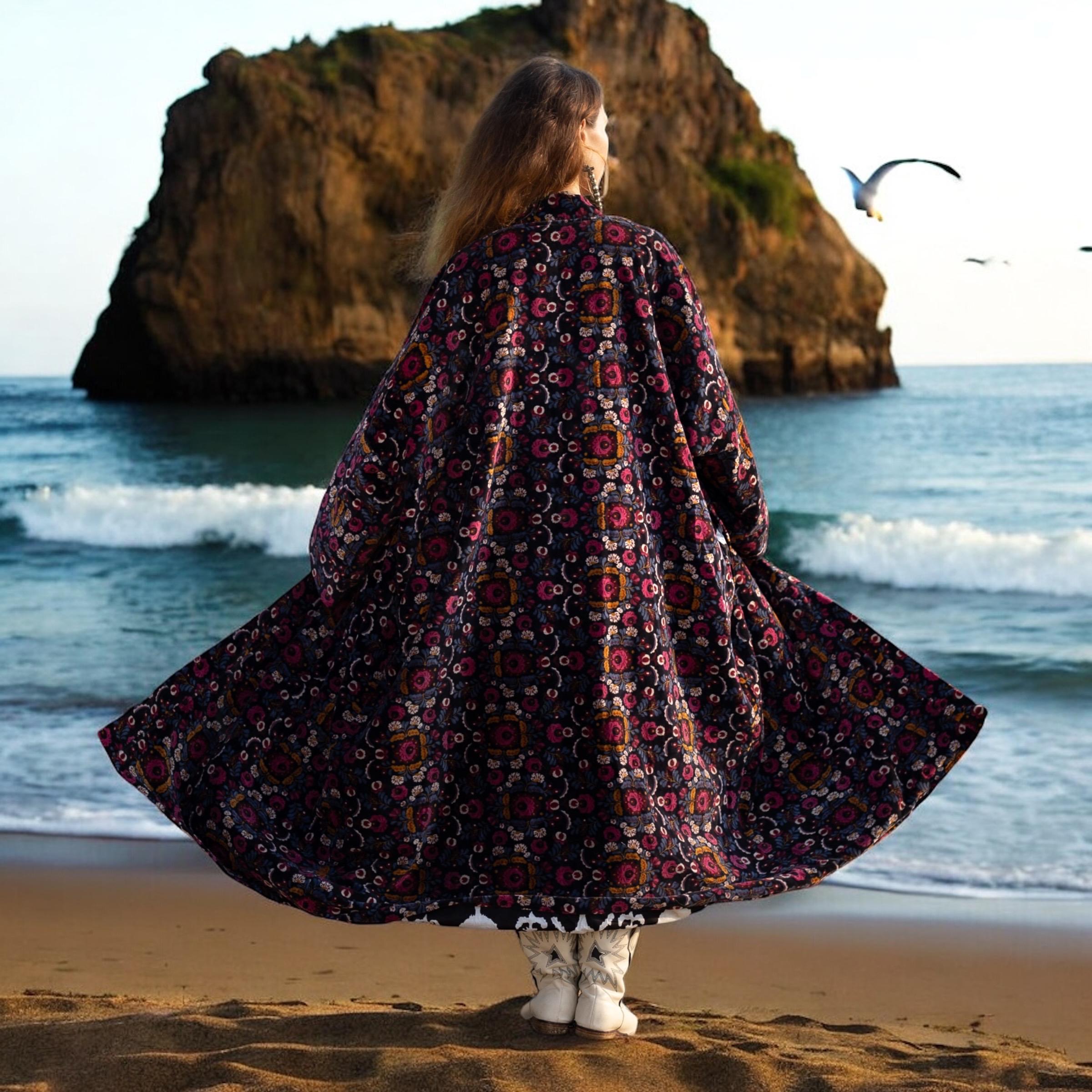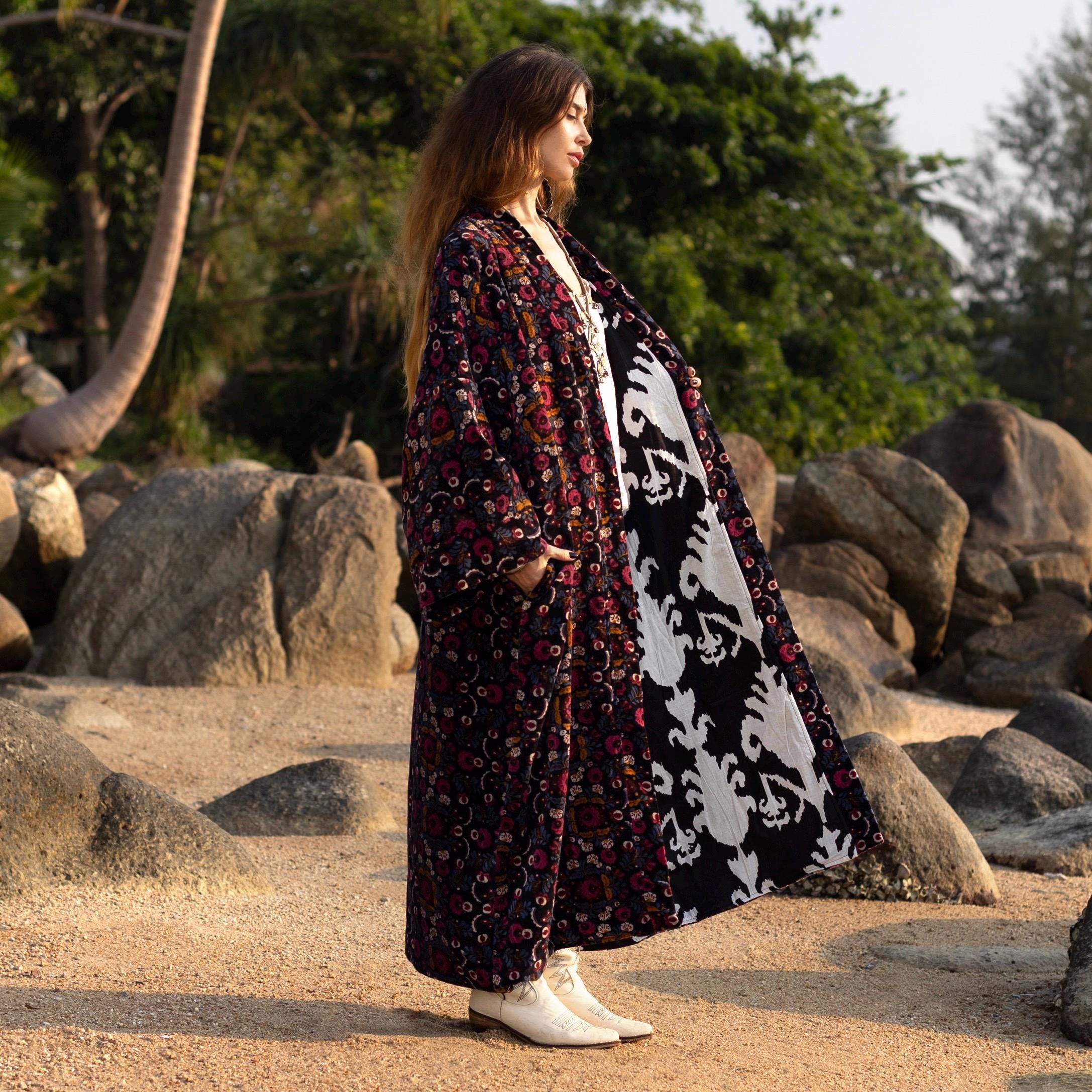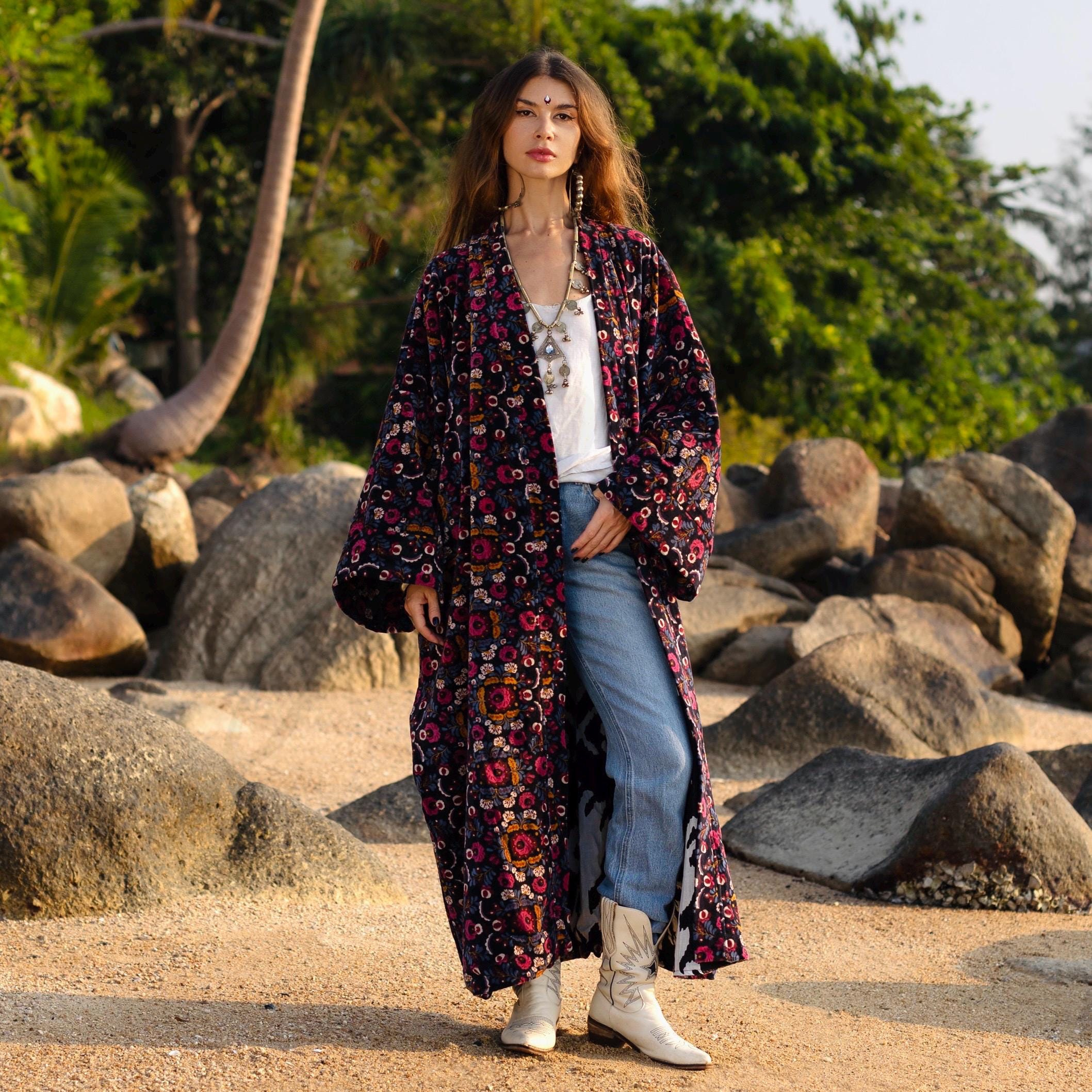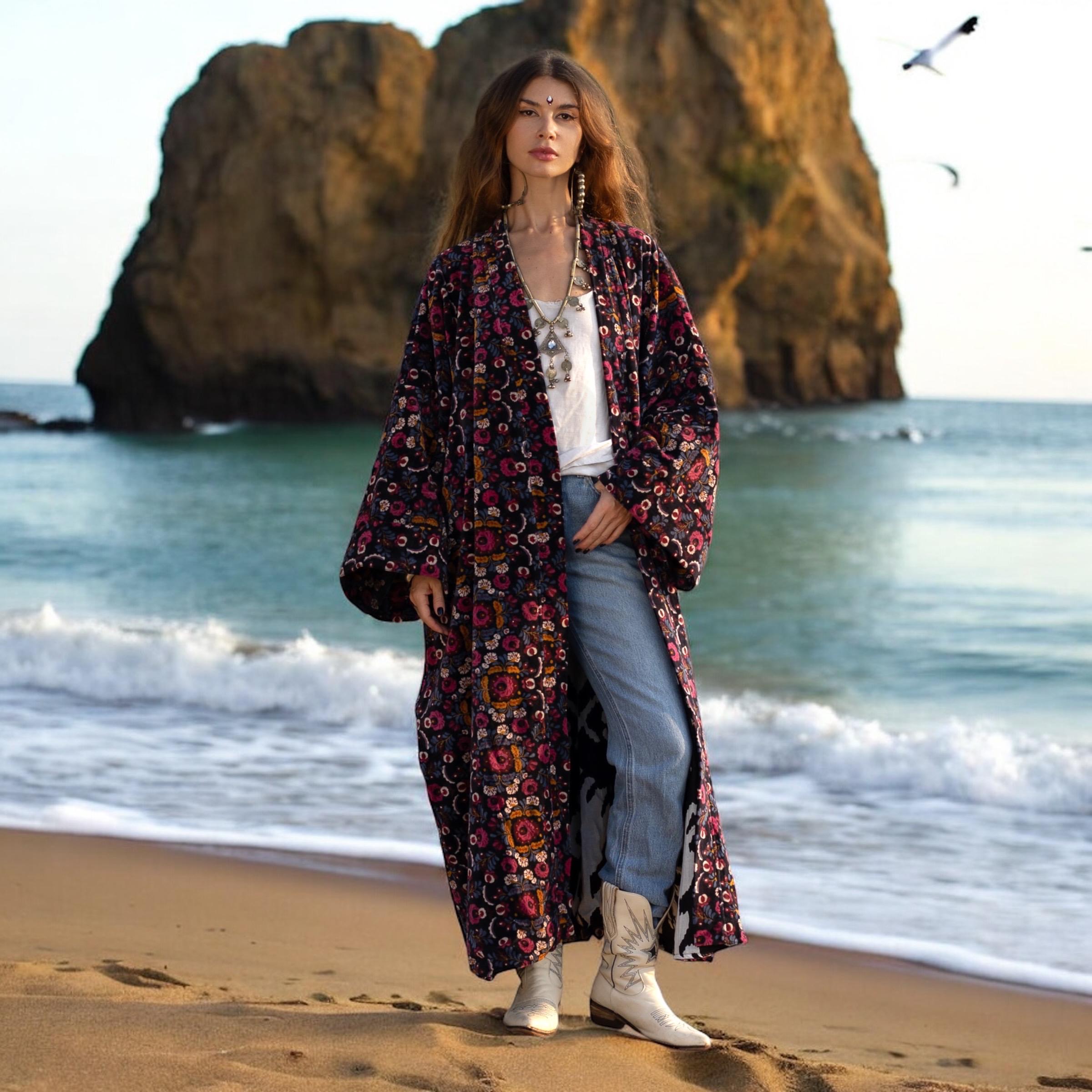 Plus Size Velvet Kimono: Hand Block Printed Floral Boho Duster – MAI