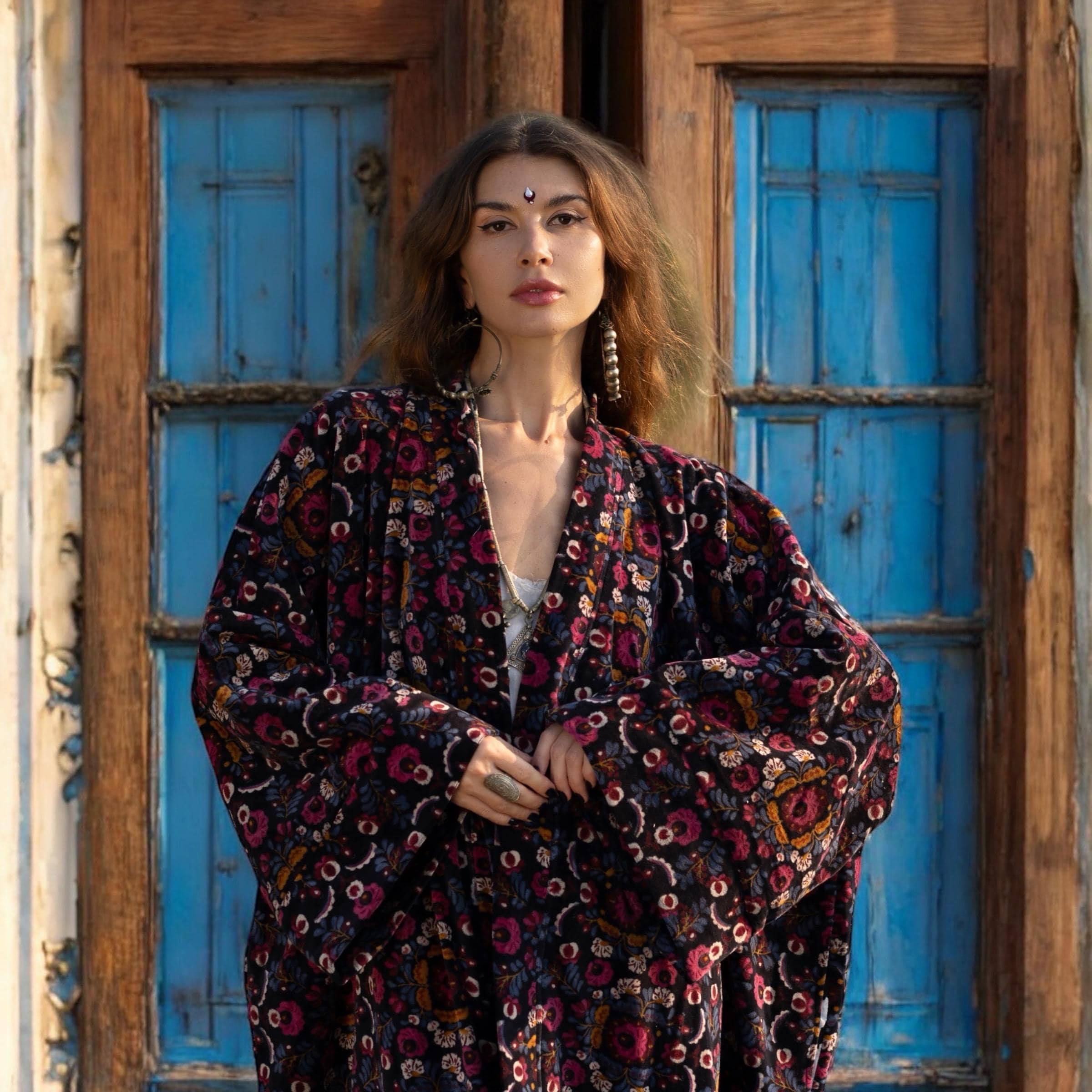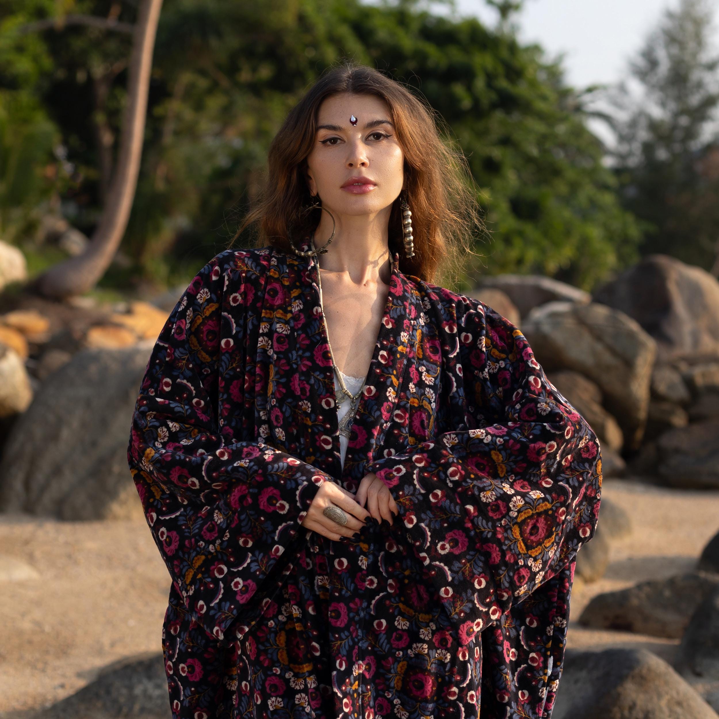 Plus Size Cotton Velvet Kimono – Hand Block Printed Boho Robe for Bridal, Festival, and Winter Magic