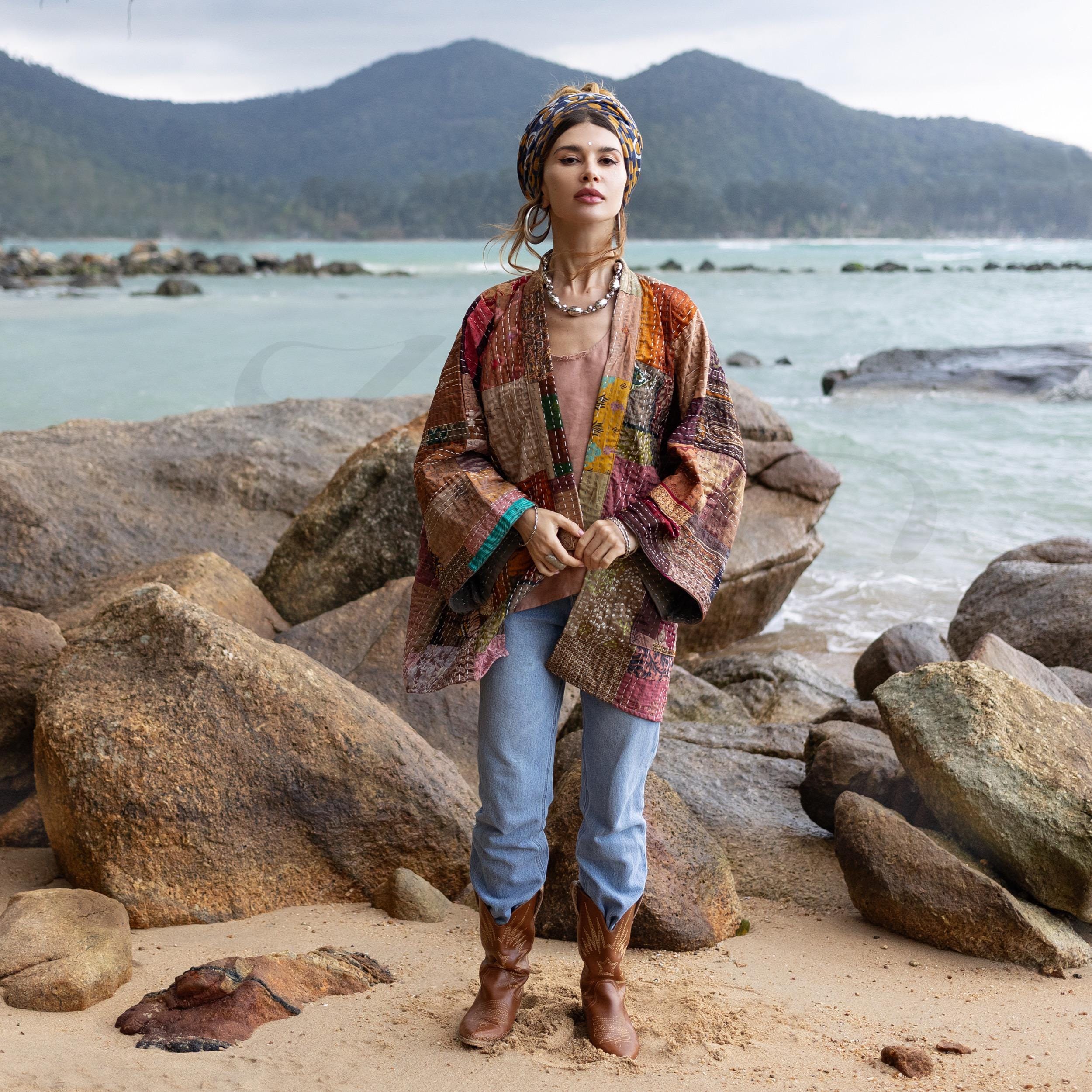 Step into timeless elegance with the Mei Silk Kimono in Canyon Bloom—a quilted silk jacket alive with warm earthy hues of terracotta, clay, berry, and golden ochre. Every patch tells its own story, hand-stitched into a harmonious mosaic that radiates artisan charm and bohemian soul.