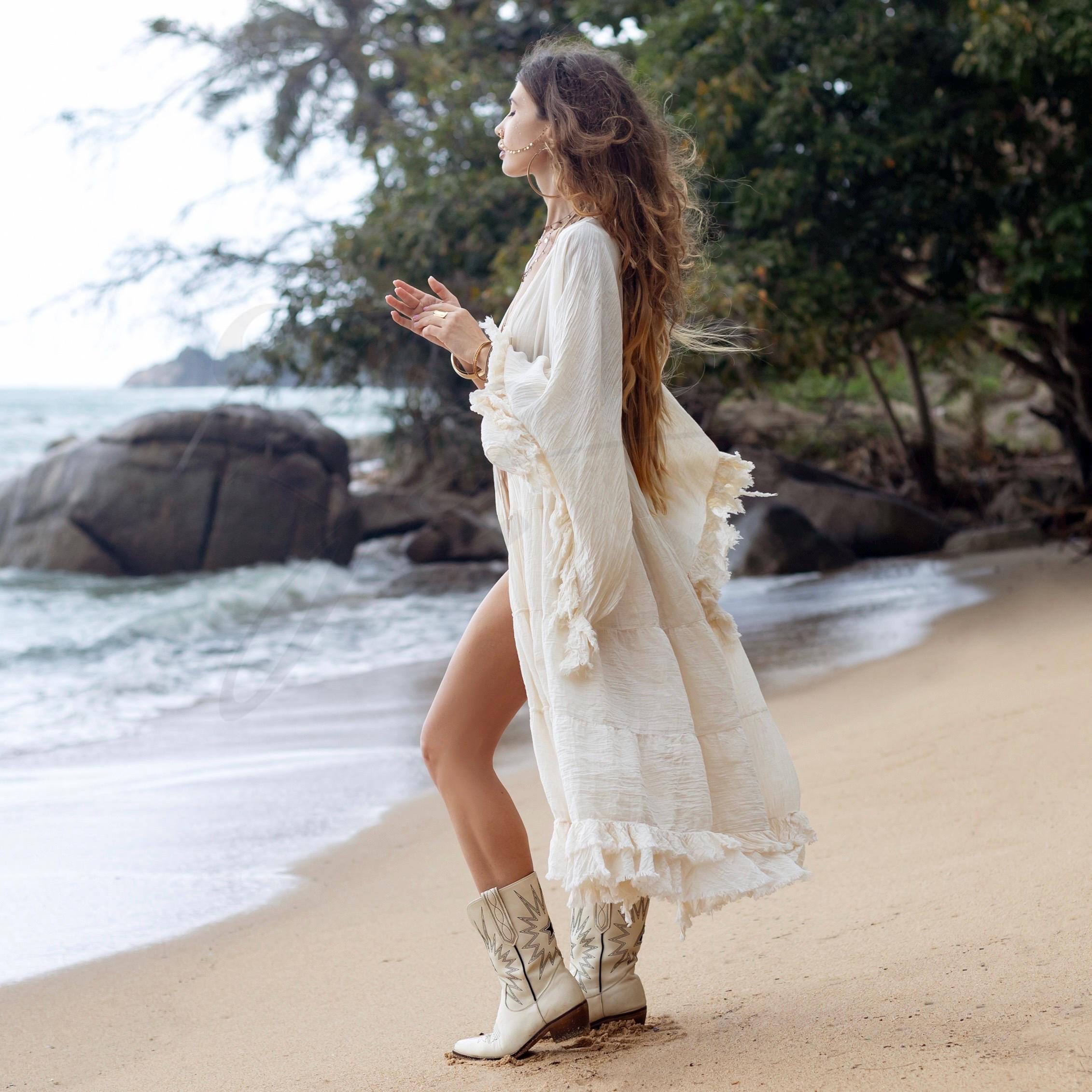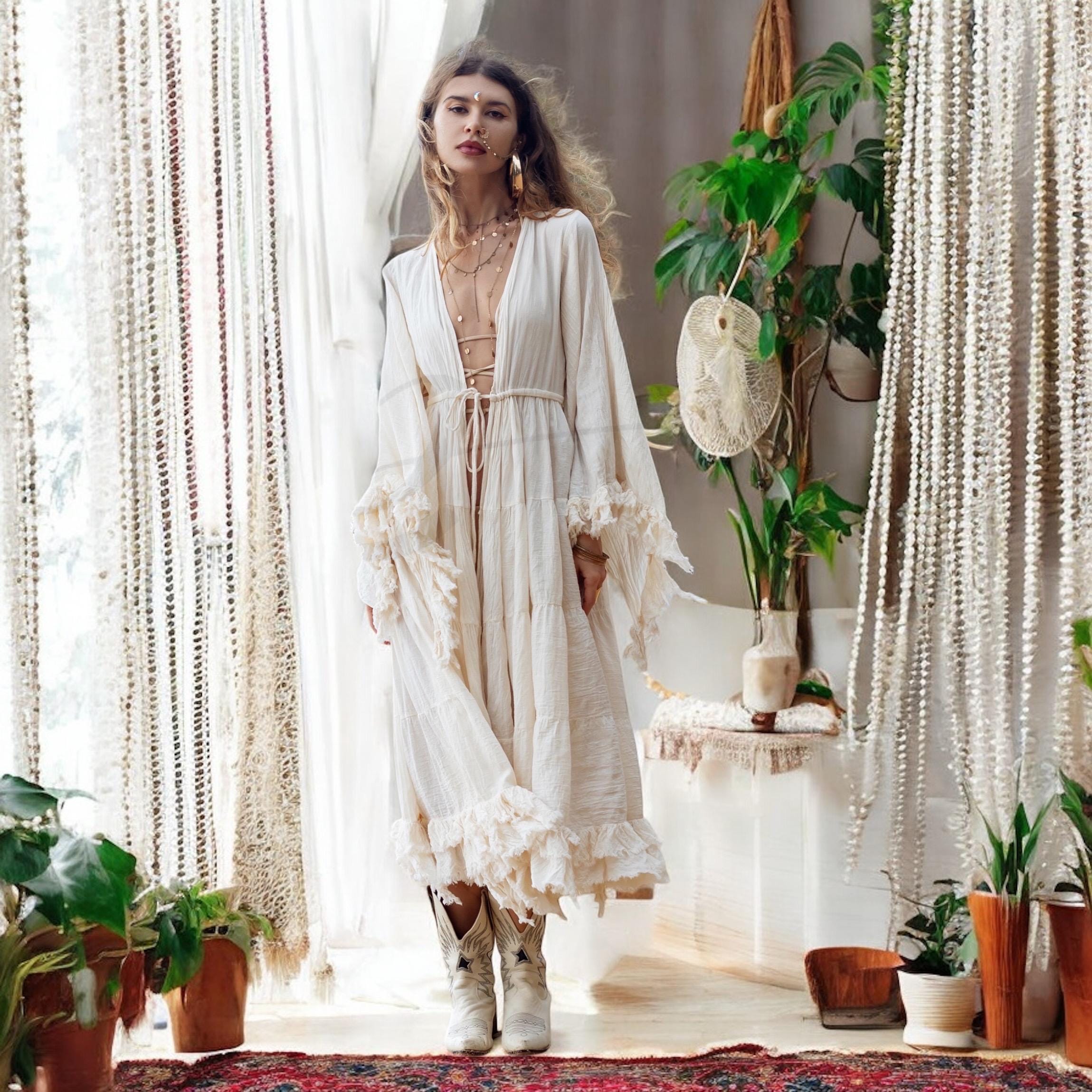 Raw Cotton Boho Maxi Kimono Duster: Ruffled Bridal Robe – Cara