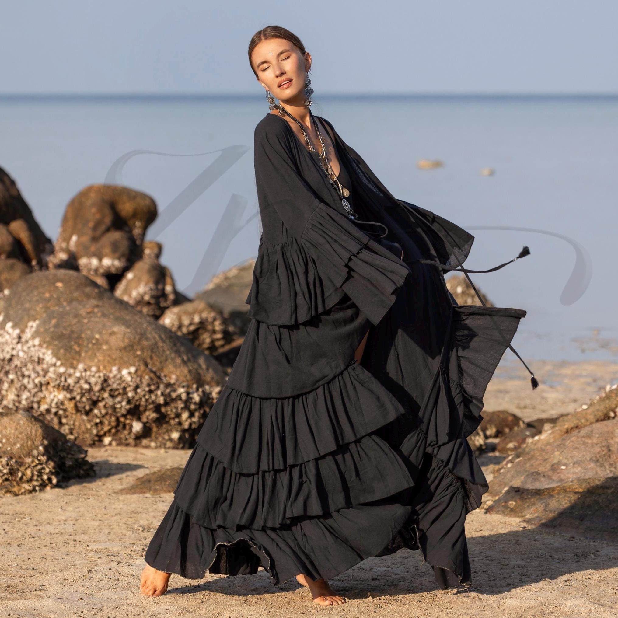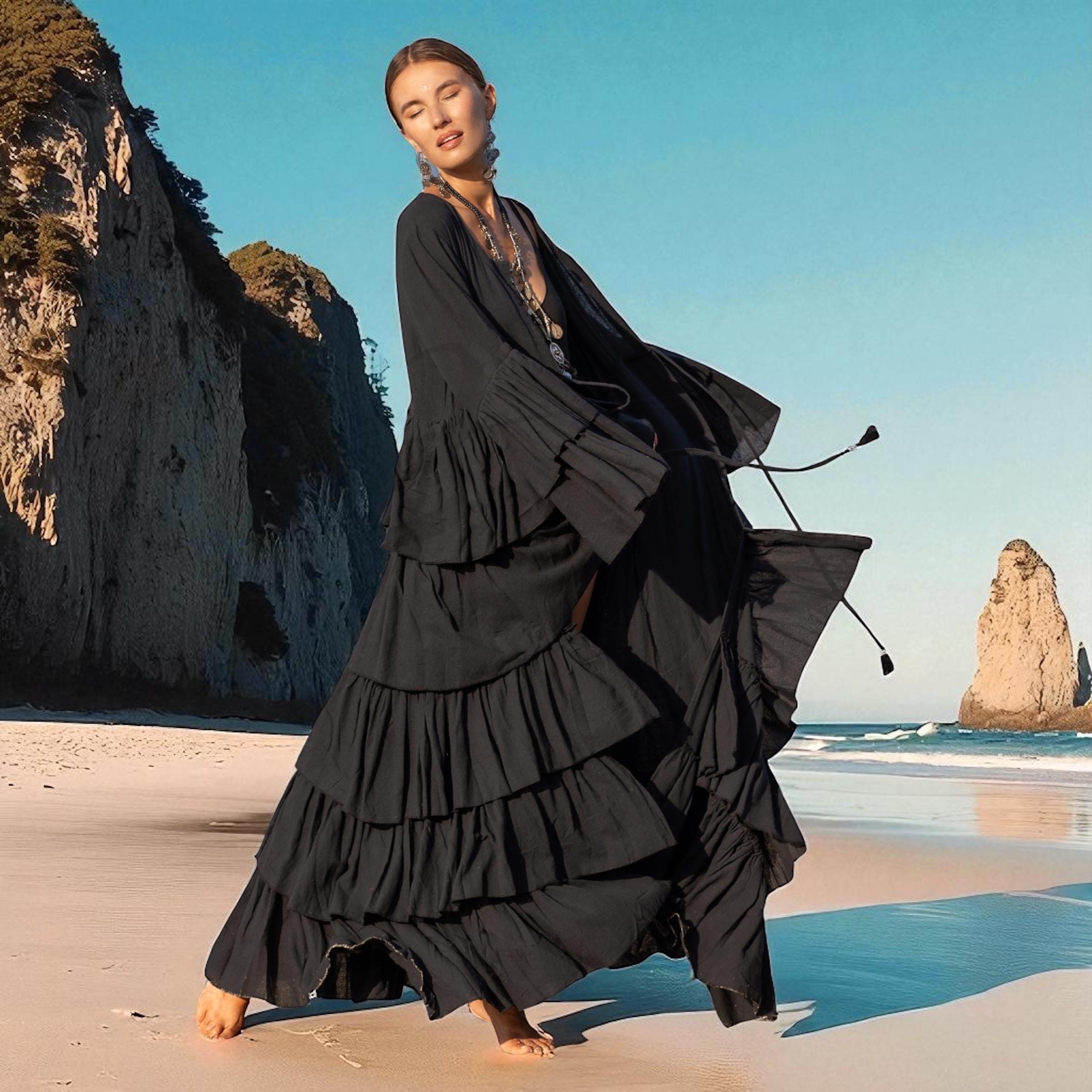 Ruffled Hemp Cotton Kimono Duster: Raven Black Bohemian Cardigan – Bali