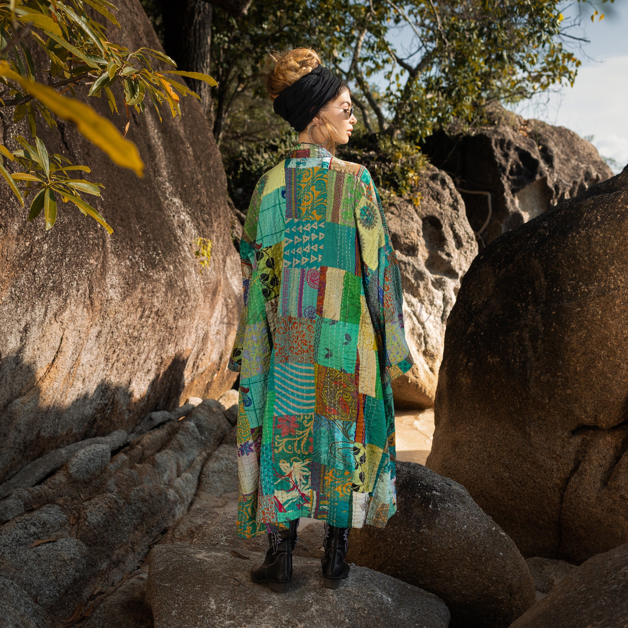 Explore the vibrant world of the Nina Silk Patchwork Kimono! 🌸✨