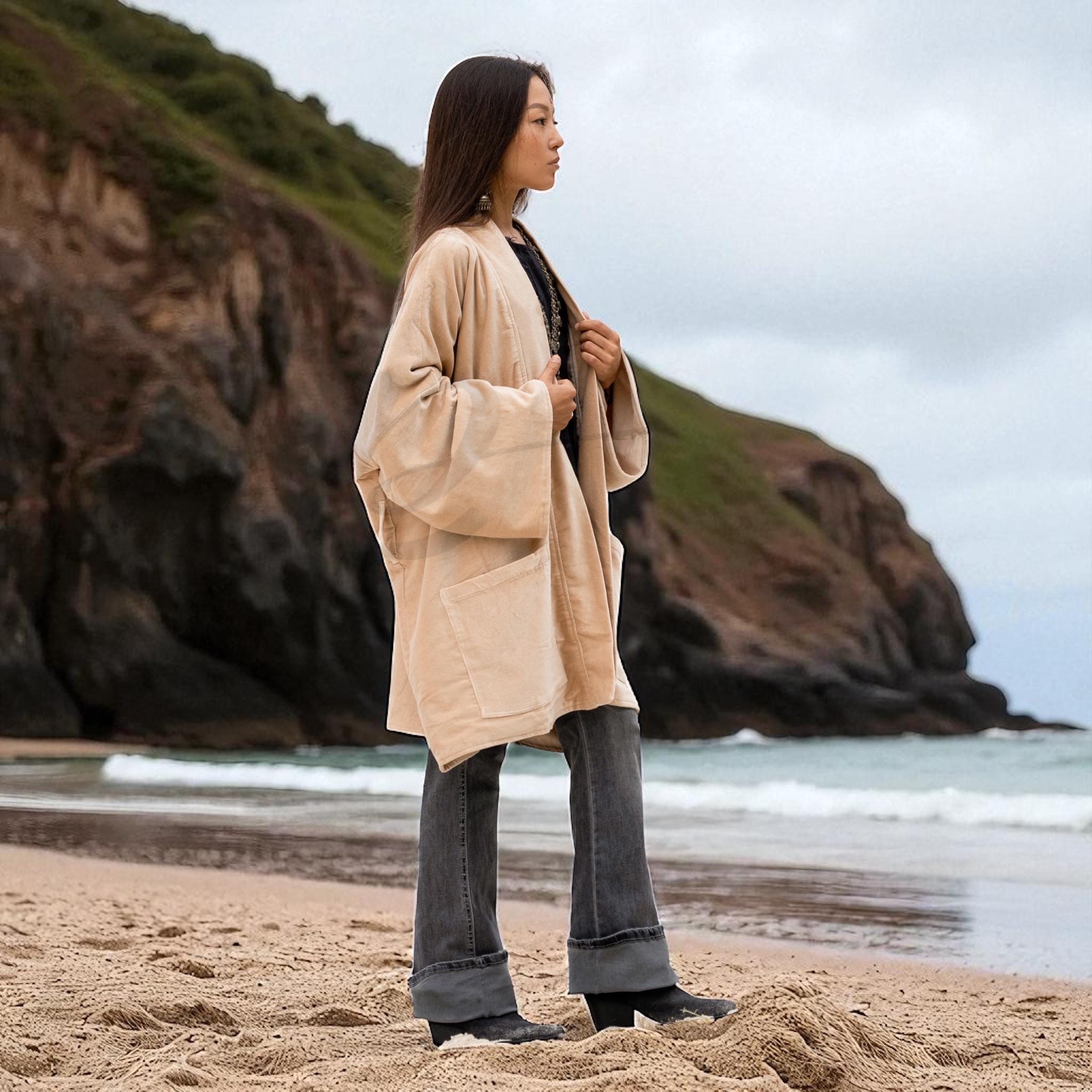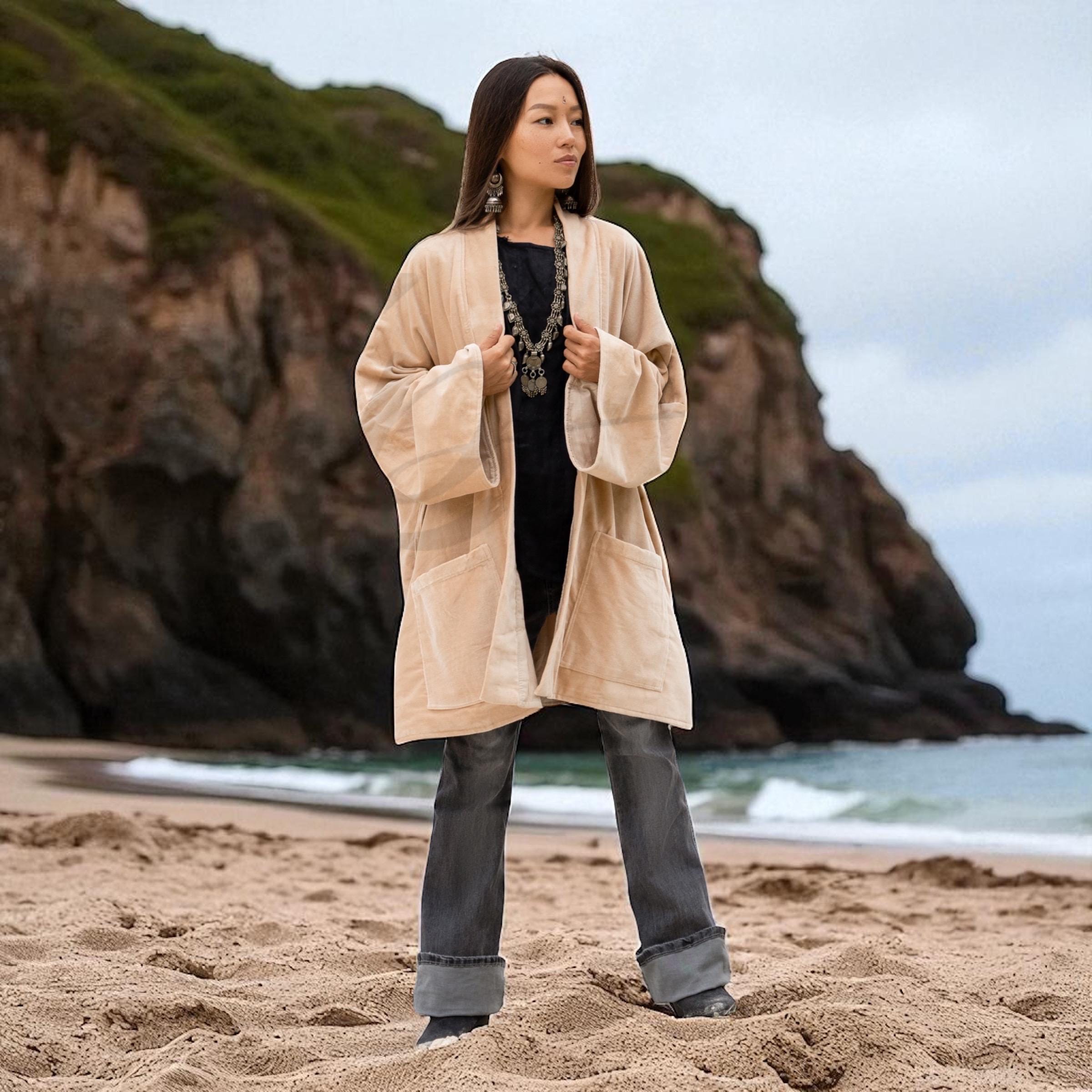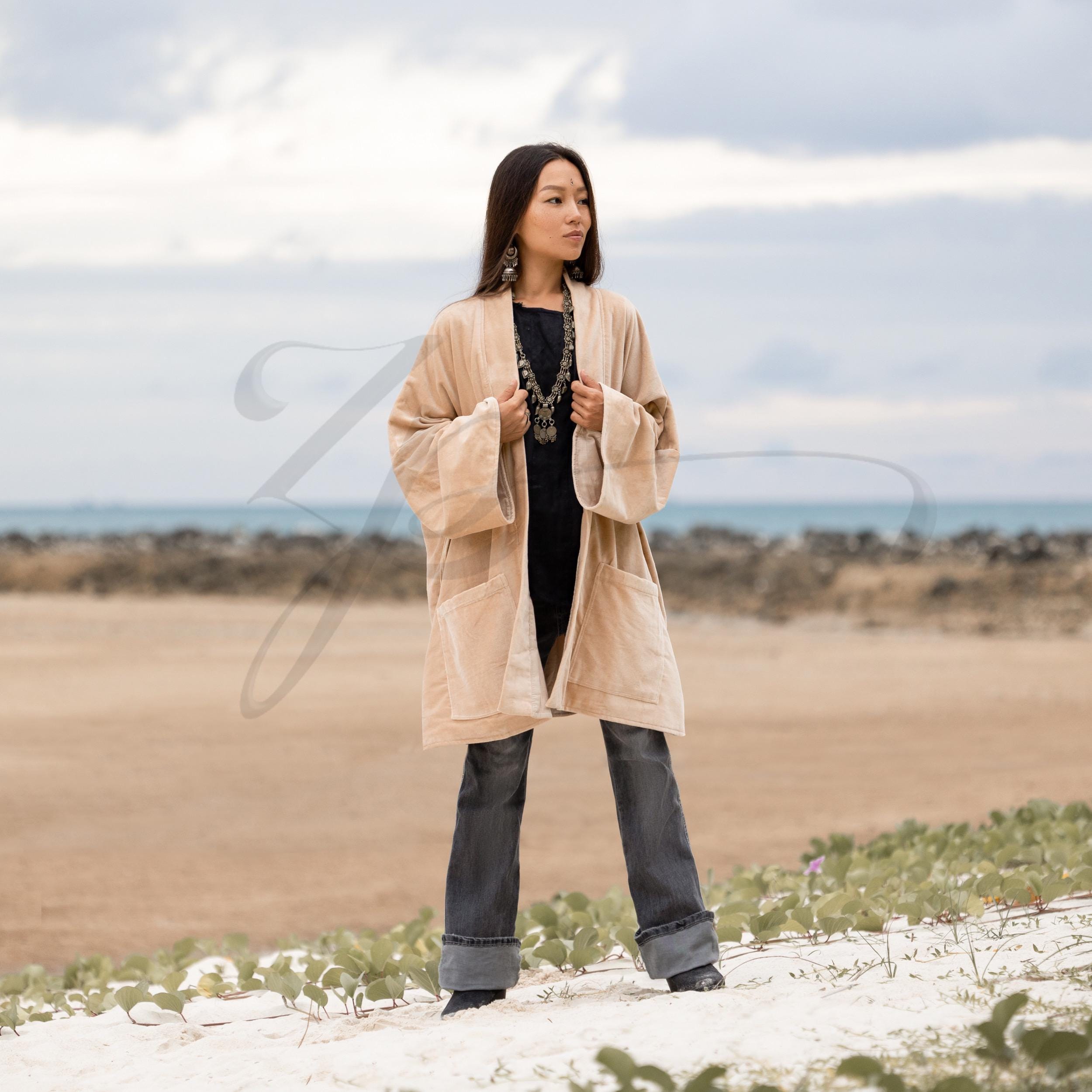 Wrap yourself in effortless elegance with the Mei Velvet Kimono in Sandstone, a timeless boho coat designed for comfort and sophistication. Crafted from 100% cotton velvet and fully lined in soft cotton, this solid neutral jacket offers versatility and style for every season. Its warm sandstone hue brings understated luxury that complements any wardrobe.