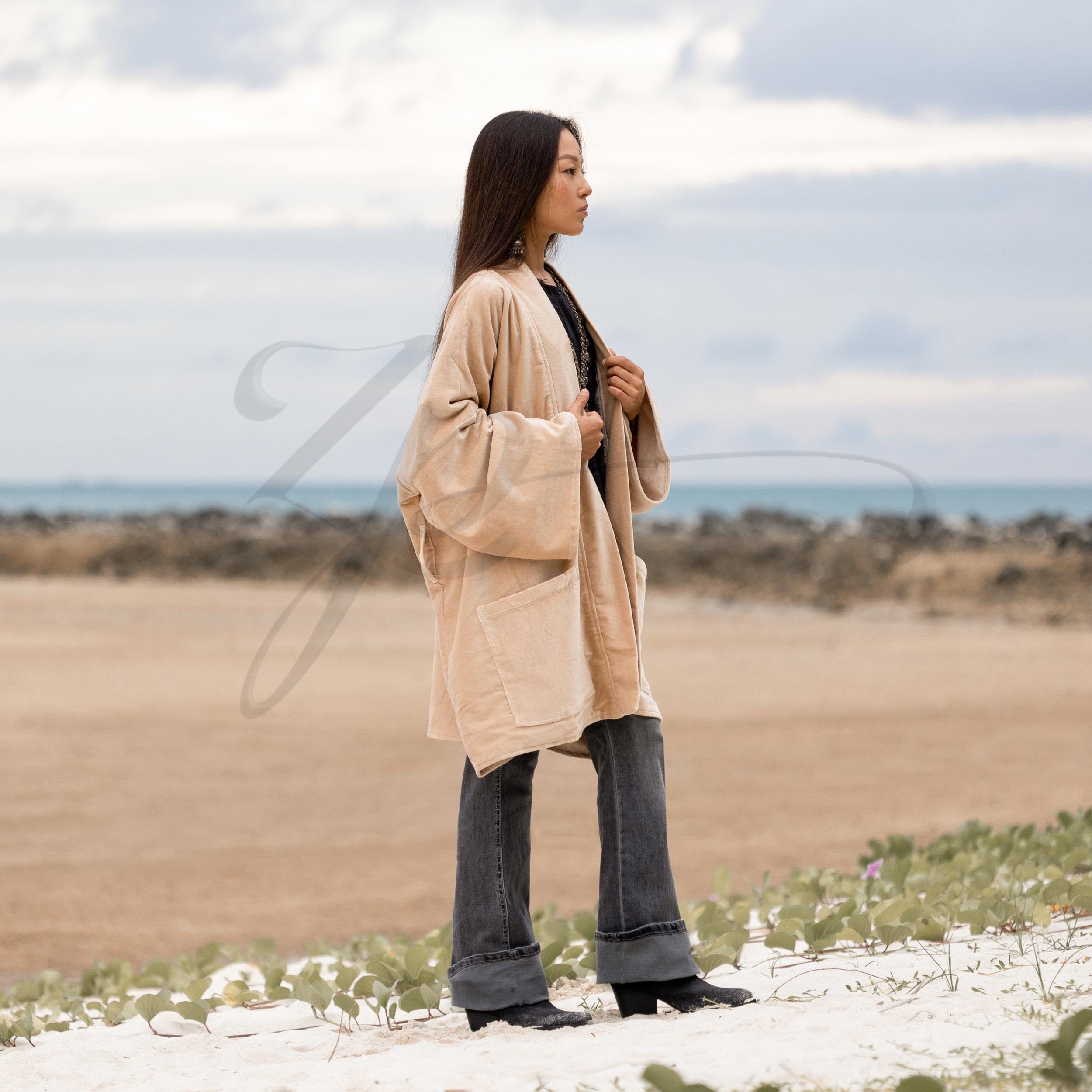 Sandstone Velvet Kimono Jacket | Solid Boho Outerwear | Mei by ZinniaPearl
