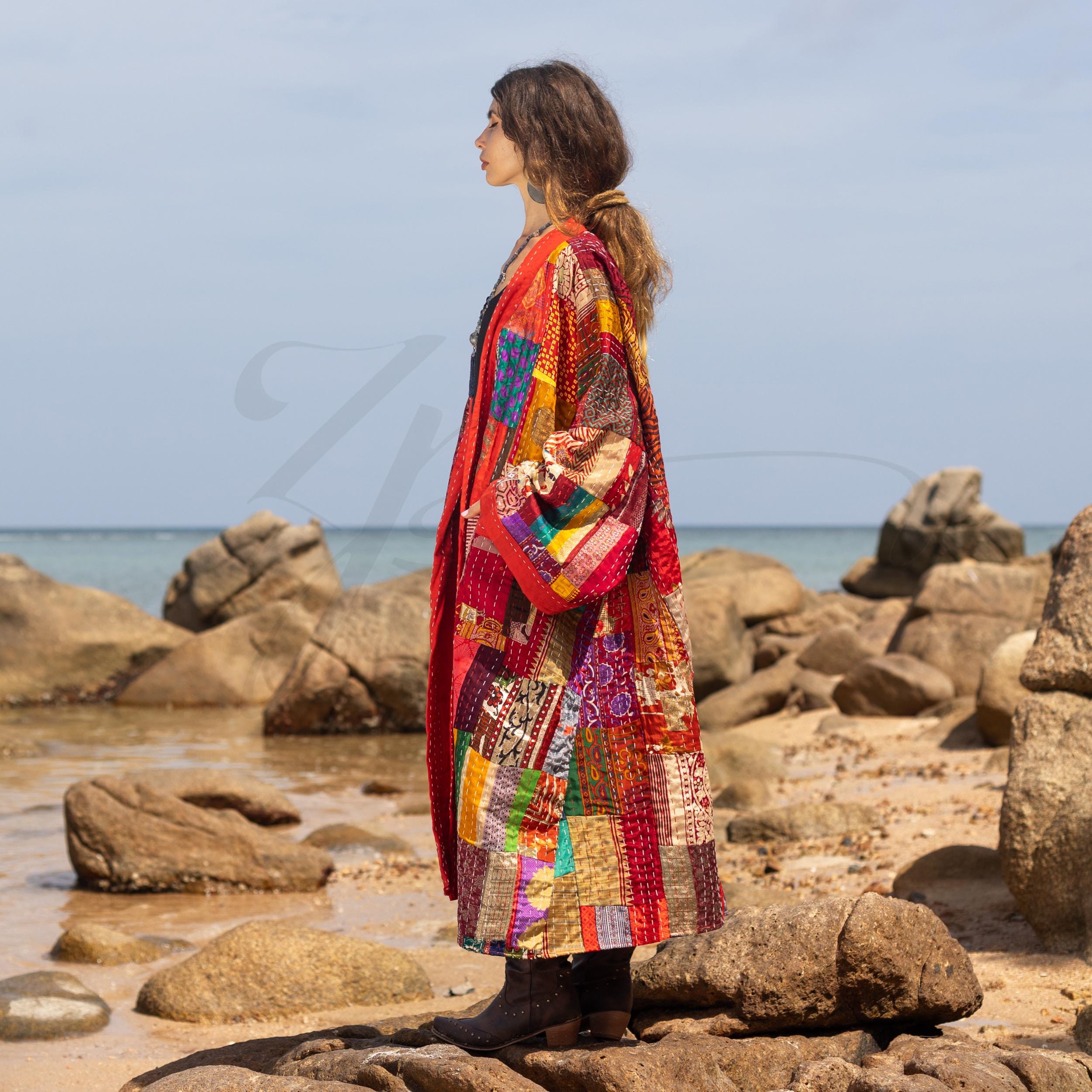 Sangria Boho Quilted Kimono Jacket: Silk Patchwork Statement Piece – Nina