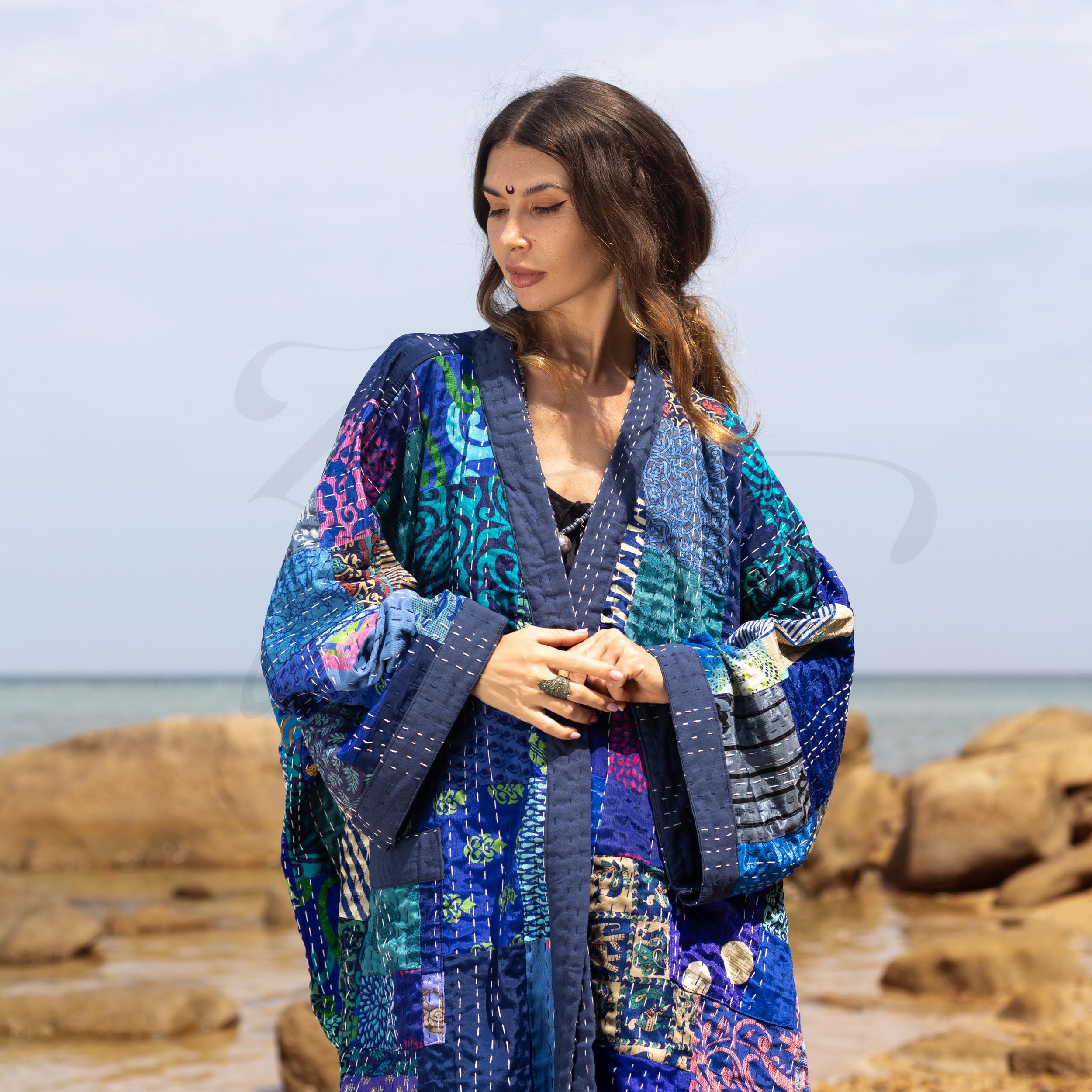 Sapphire Silk Patchwork Kimono: Hand-Quilted Boho Robe – Ninive