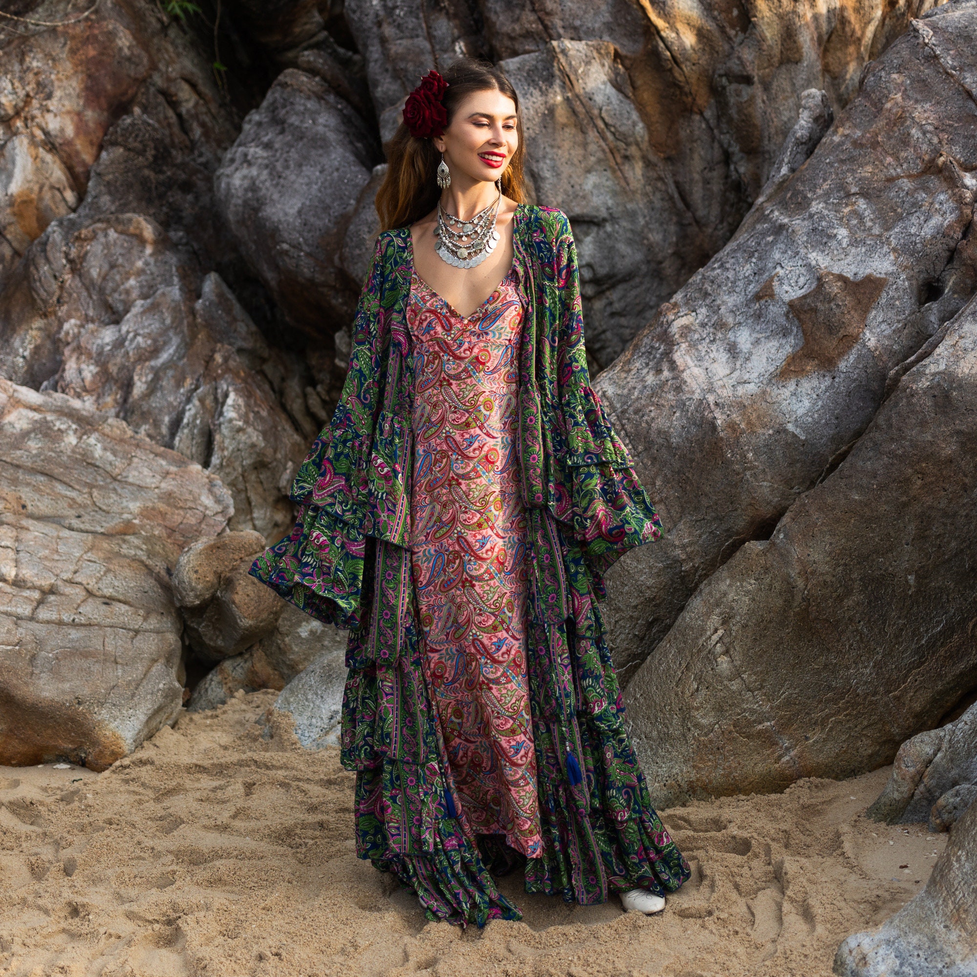 Silky Boho Maxi Slip Dress: Paisley Print Lounge Gown – Dalia