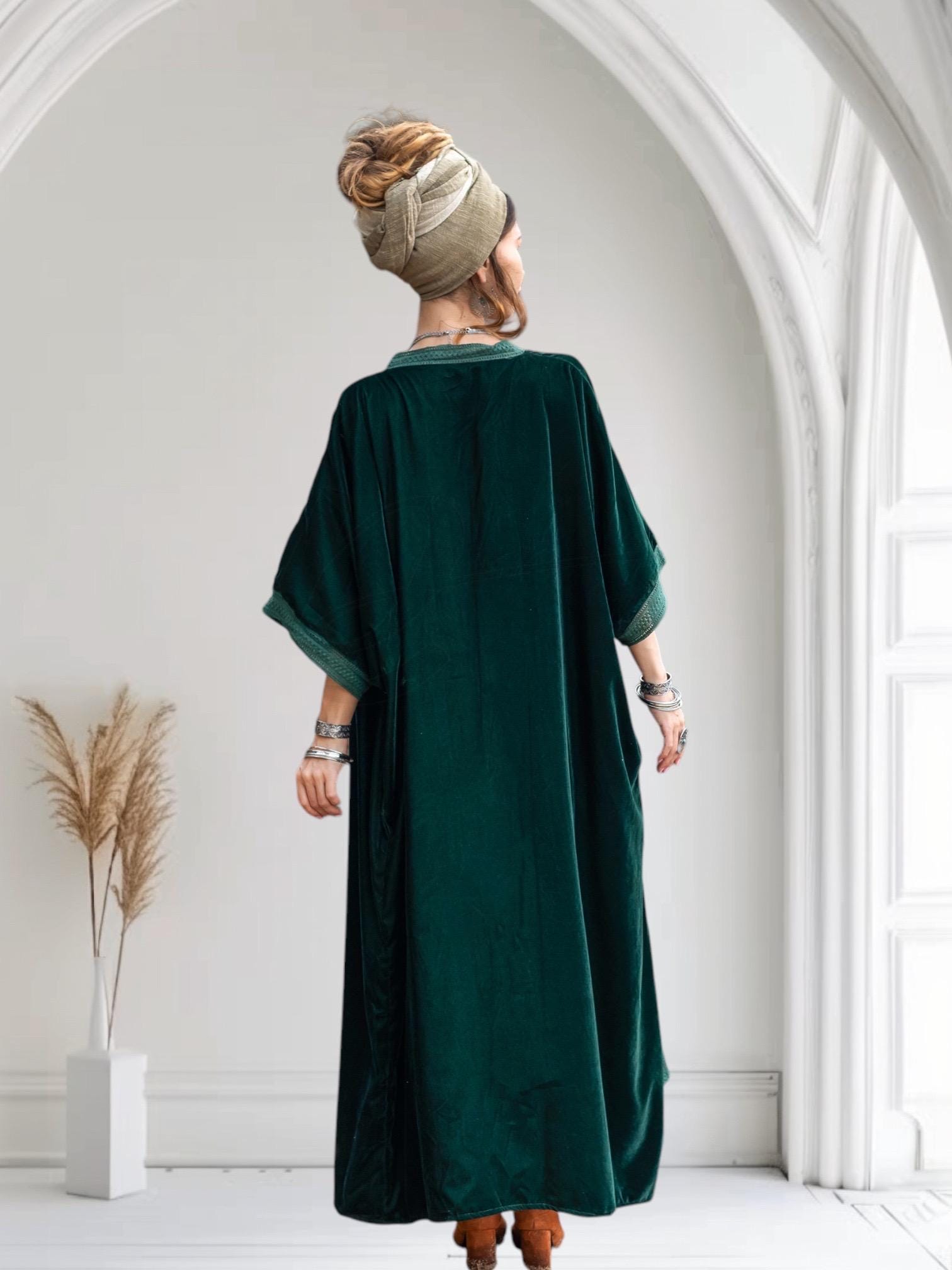 Step into a world of luxurious bohemian charm with the Misty Emerald Velvet Lace Kimono Duster by ZinniaPearl. This silky lace-trimmed velvet maxi coat drapes effortlessly, offering a vintage-inspired look with a touch of gothic romance. Whether you’re dressing for a festival, wedding, or evening event, this handmade statement piece will envelop you in elegant, boho-chic sophistication.