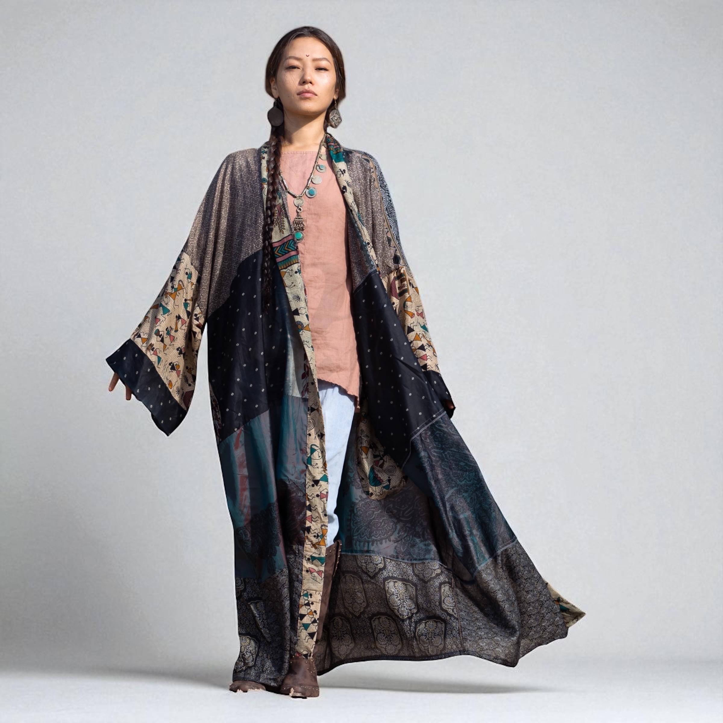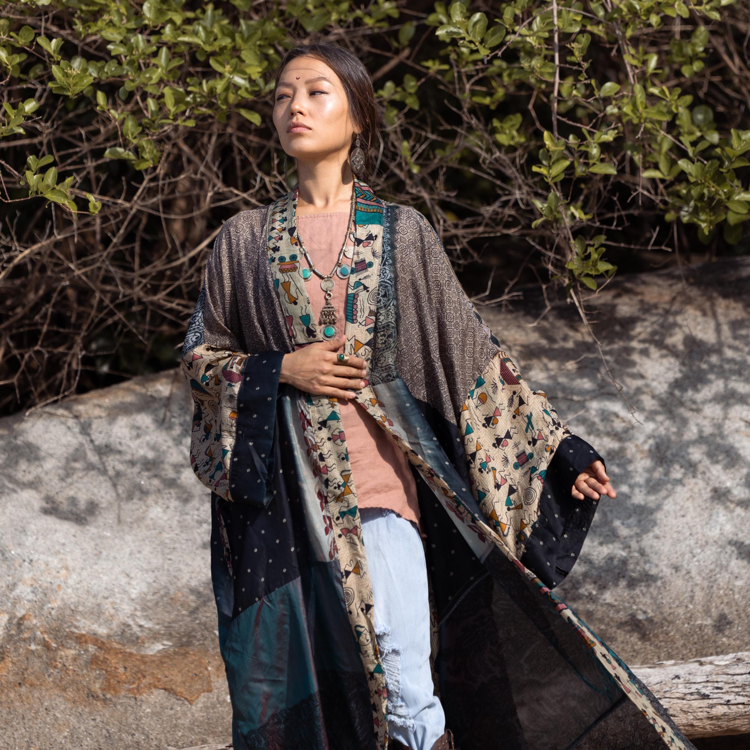 Wrap yourself in twilight-hour magic with the MAI duster in Desert Moon—a soulful kimono robe handcrafted from upcycled vintage silk saris. Its serene palette of deep indigo, mystical gray, and moonlit cream comes alive with artisan block prints, creating a flowing patchwork that moves like poetry and radiates bohemian elegance.