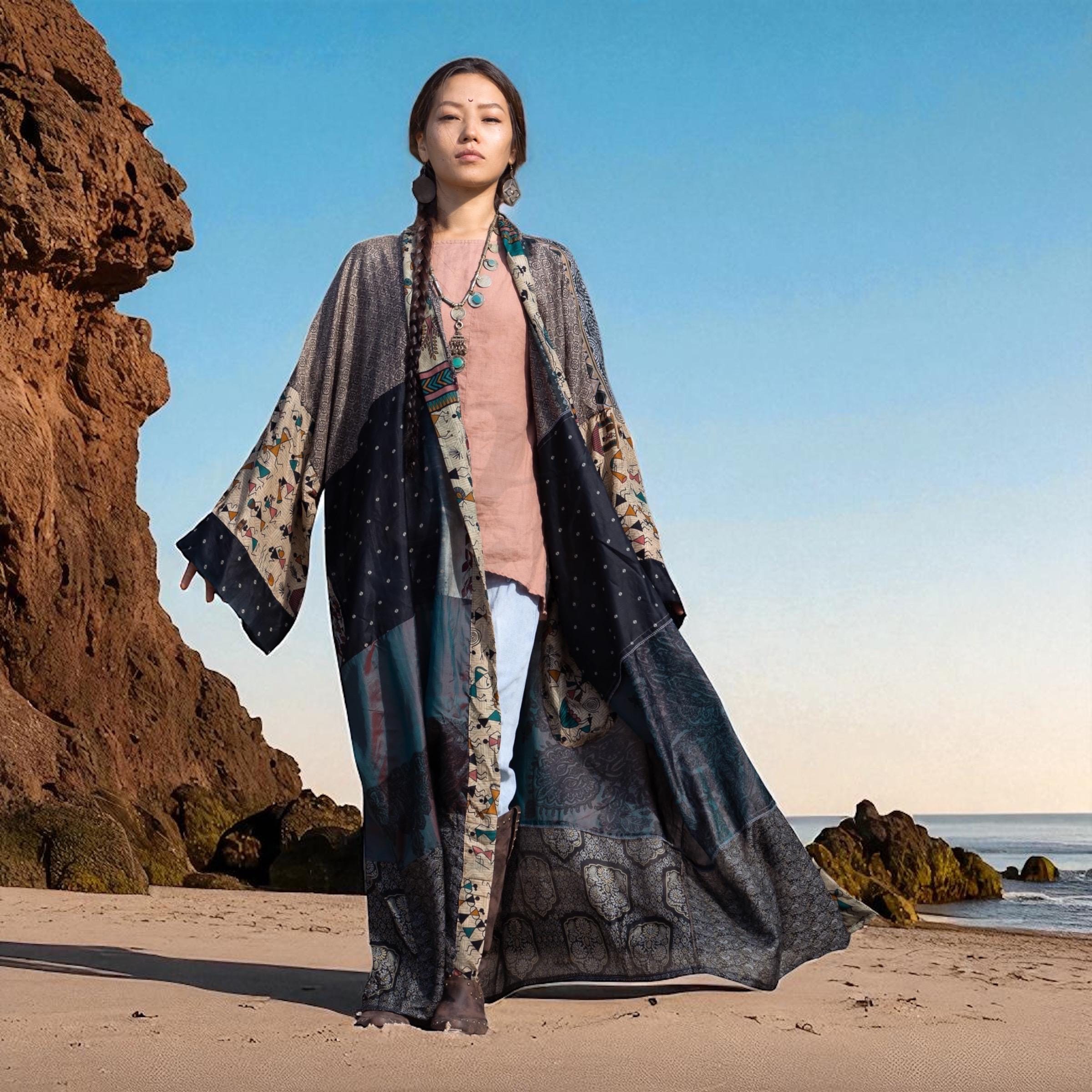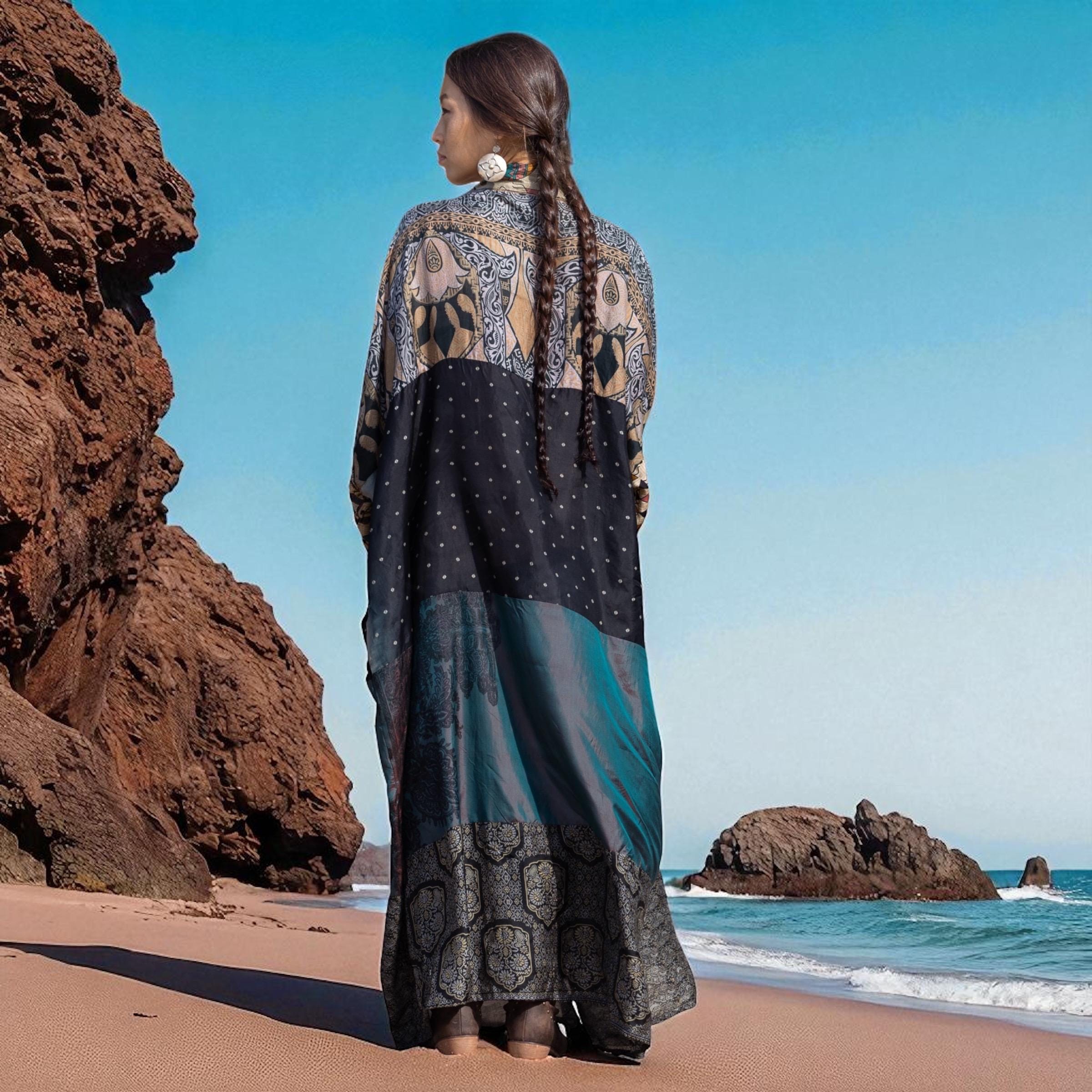 MAI Vintage Silk Kimono Duster – Desert Moon Patchwork Robe | Upcycled Festival Jacket, Long Beach Cover-Up, Gift for Her