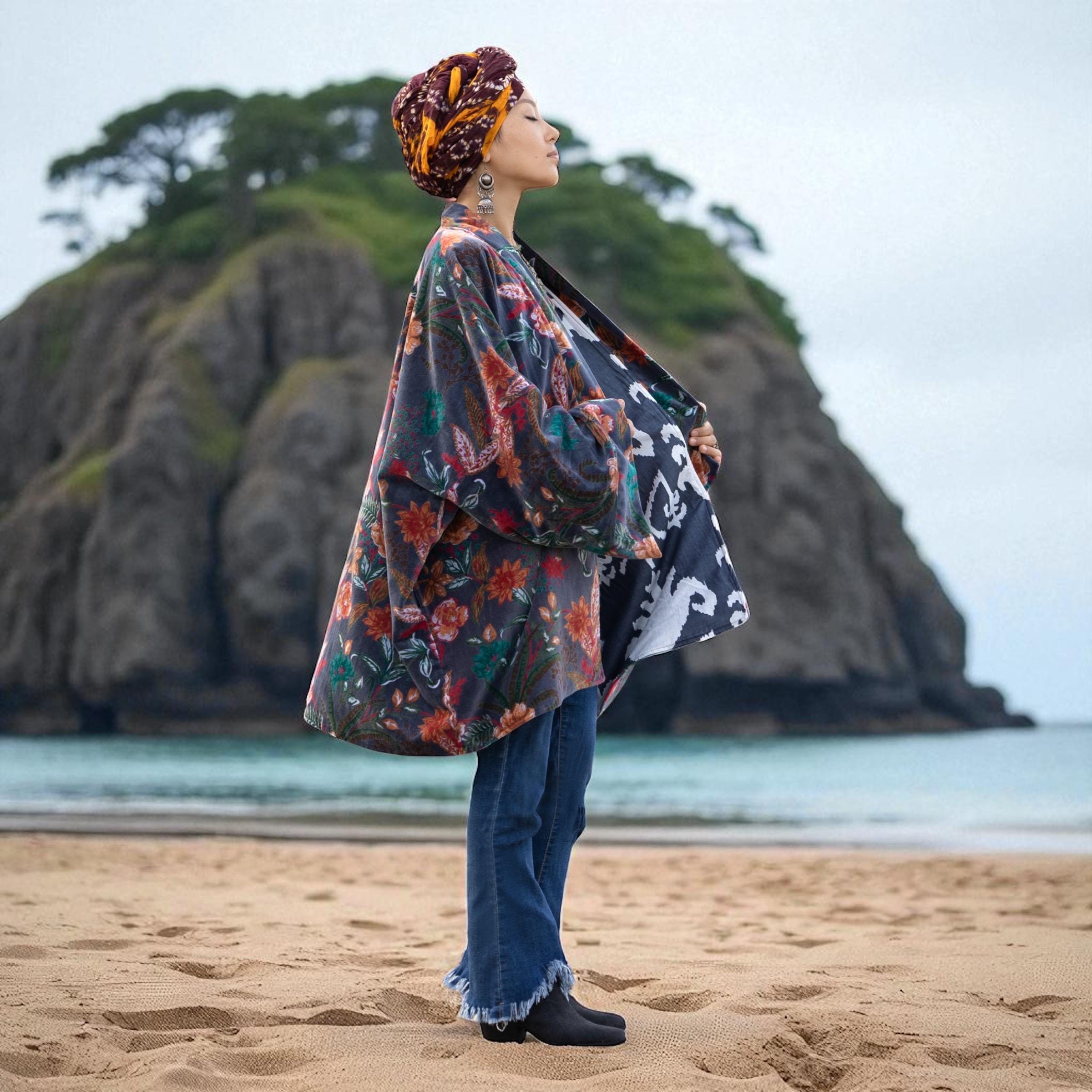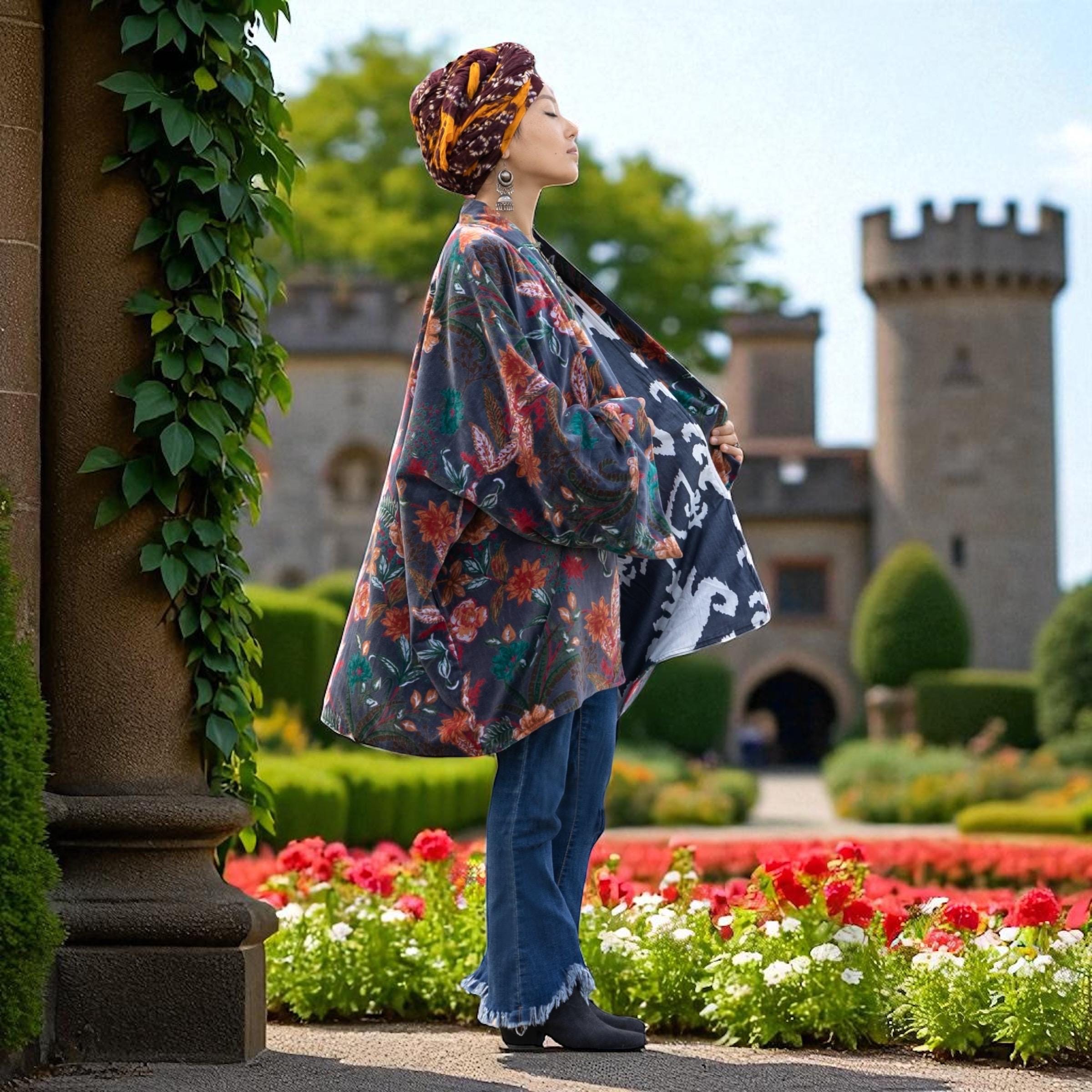 Embrace the mystery of twilight florals with the Mei Kimono Jacket in Nocturne Bloom — a handcrafted velvet masterpiece bathed in moody midnight hues and vivid botanical bursts. Deep indigo grounds this lush floral tapestry, where ember orange, marigold, crimson, and pine green blooms swirl like a garden under starlight.