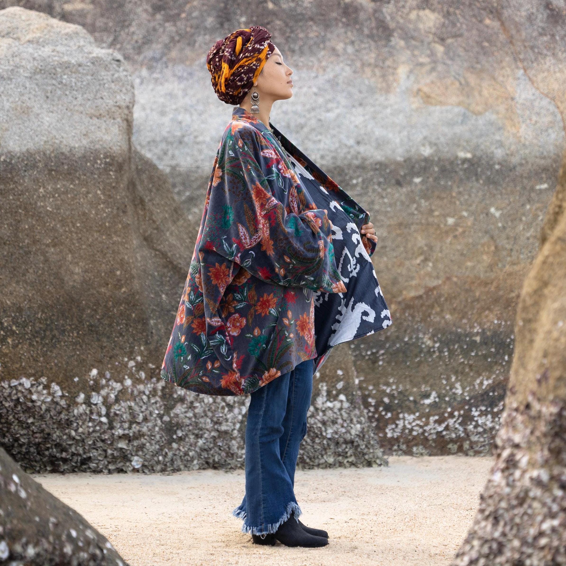 Velvet Kimono Jacket: Nocturne Bloom Floral Print, Plus Size Boho Coat – Mei