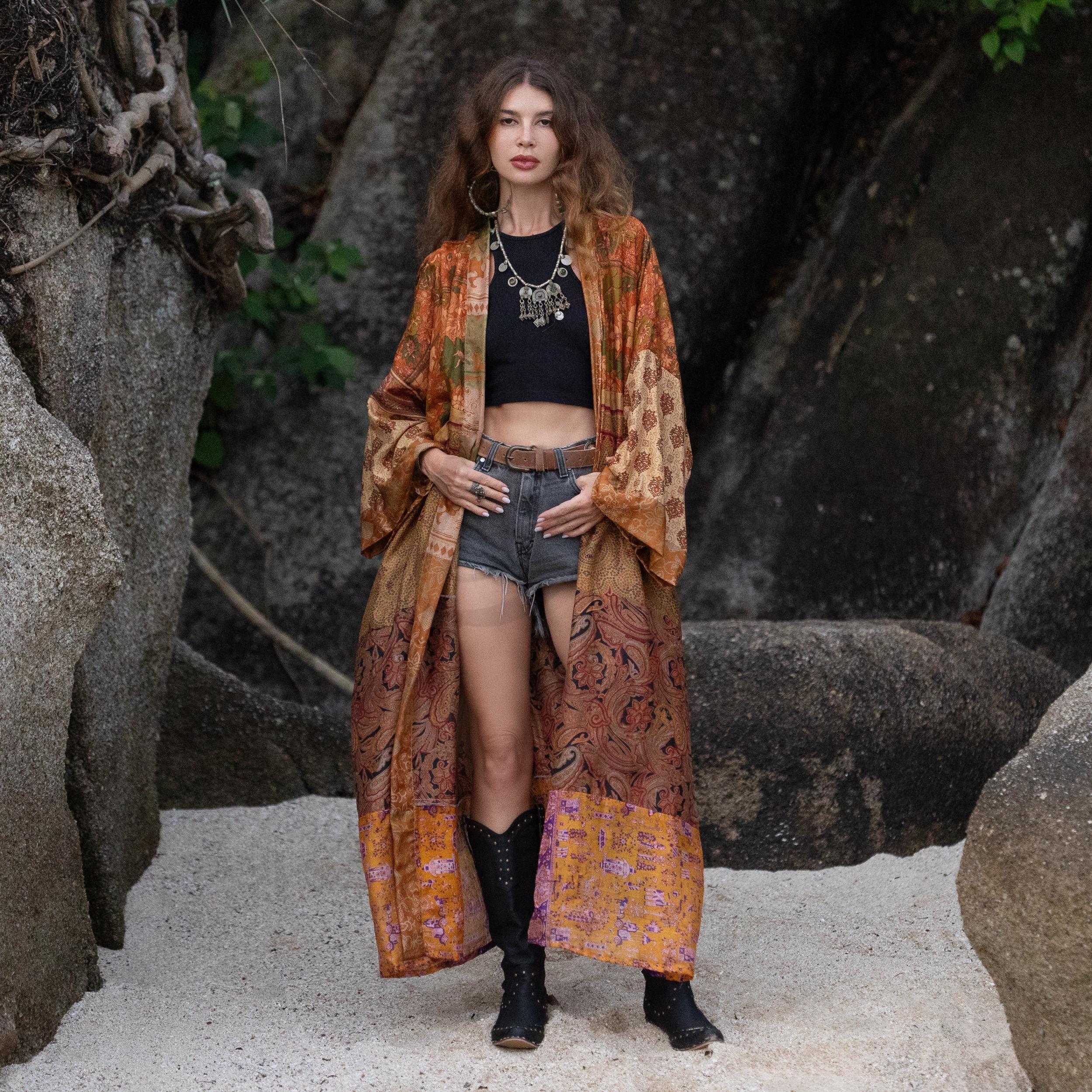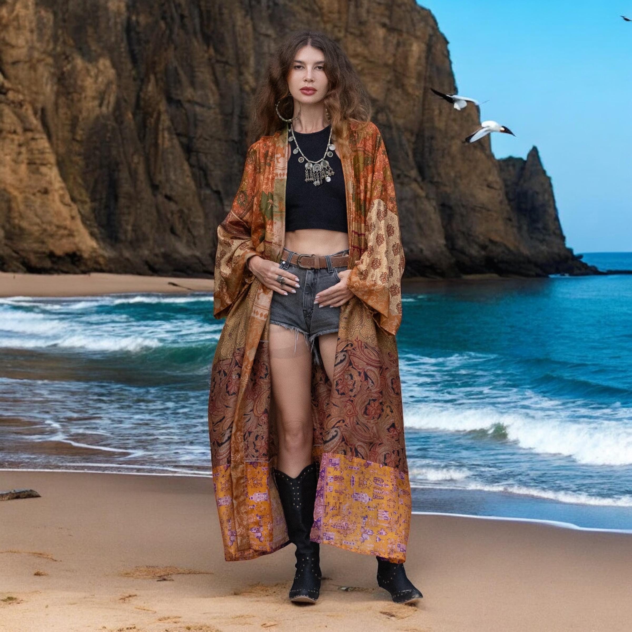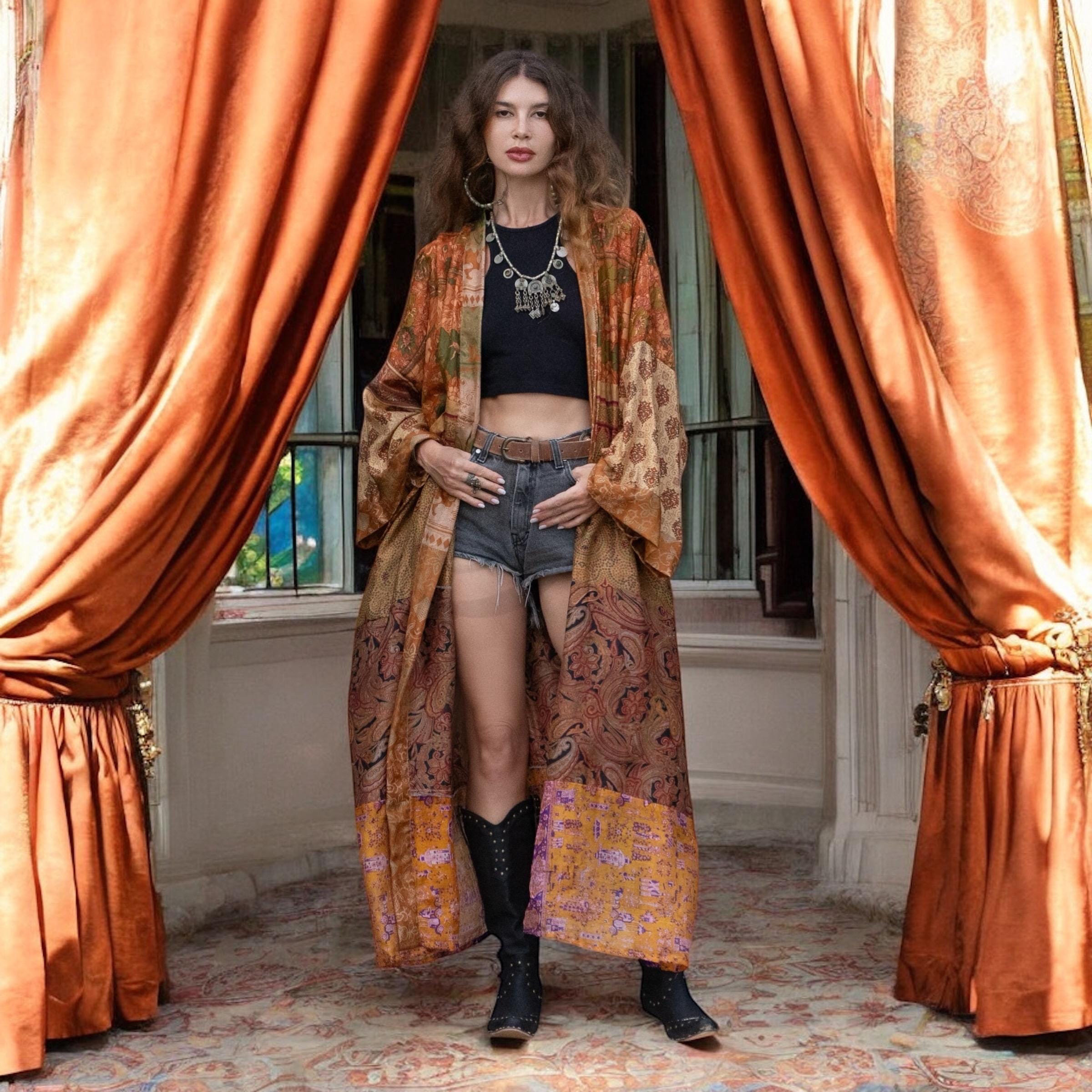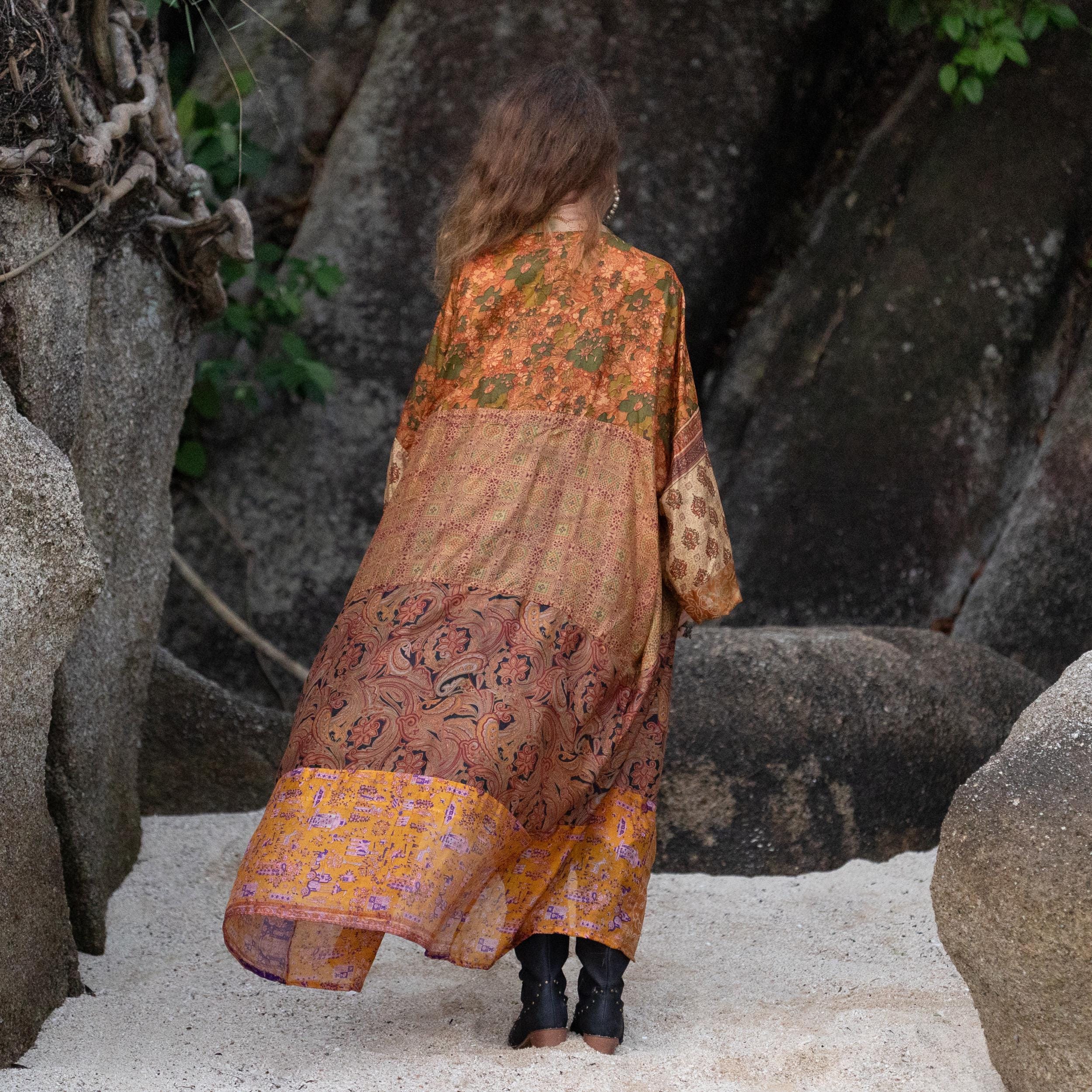 MAI Vintage Silk Kimono Duster – Amber Tapestry Boho Block Patchwork Robe | Upcycled Festival Jacket, Long Beach Cover-Up, Gift for Her