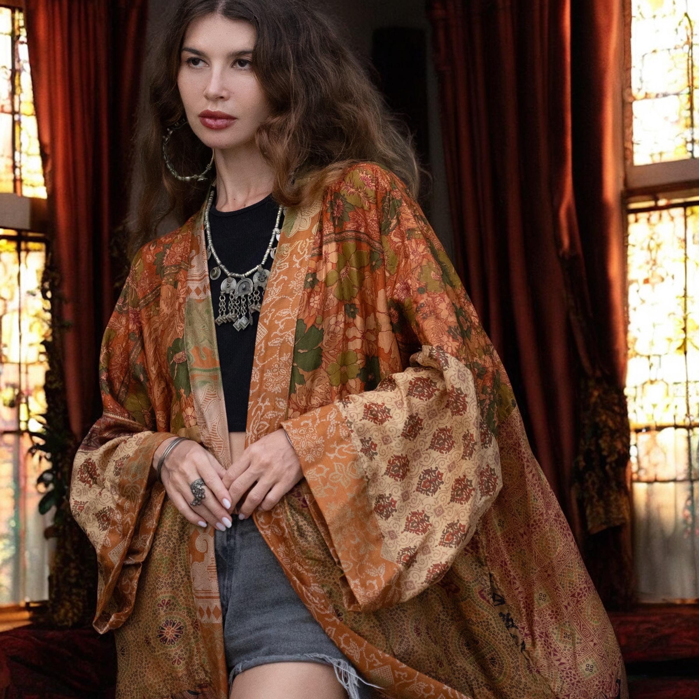 Wrap yourself in golden hour magic with the MAI duster in Amber Tapestry—a soulful kimono robe handcrafted from upcycled vintage silk saris. Featuring a rich palette of sun-warmed ochre, earthy florals, paisley scrolls, and hand-block prints, this flowing patchwork piece moves like poetry and radiates artisanal charm.
